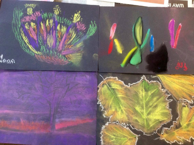 We are very fortunate that a well known artist Angie Seaway is running our art club every week. Today we explored pastels, Kandinsky’s circles, flowers, leaves and landscapes. These are fantastic!