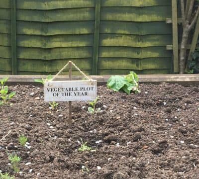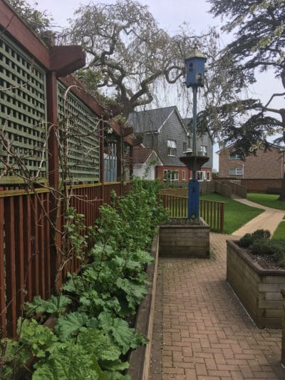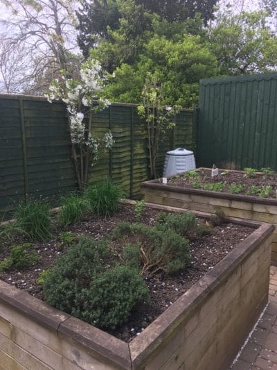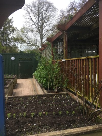The new raised bed has been planted out and we’ve had some new lawn laid. The allotment beds have been planted out by the residents complete with labels all neatly in a row. Our doves are busy nesting. The fruit trees have come into flower and the red currents and grapes are about to.