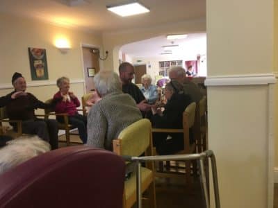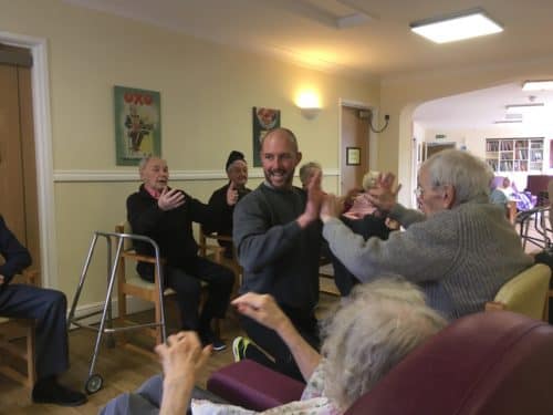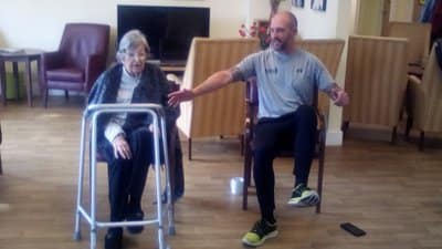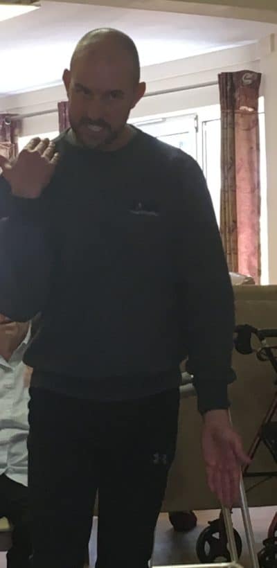 …. brings energy and enthusiasm to the weekly exercise class at the Lodge. These pictures were taken today (he really isn’t as menacing as he looks in the first picture!)