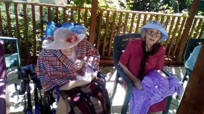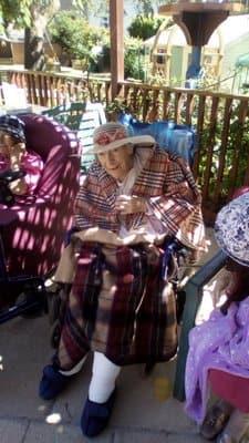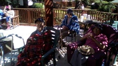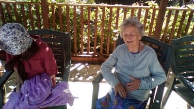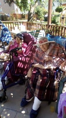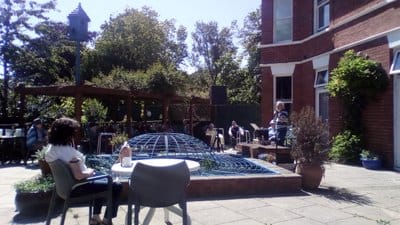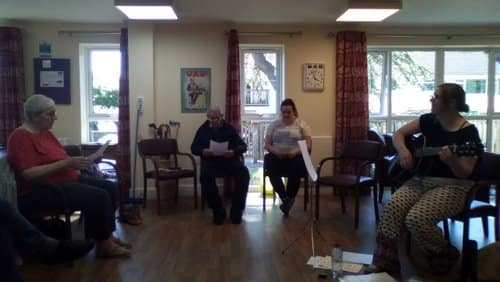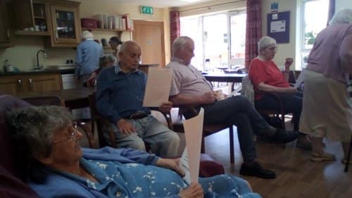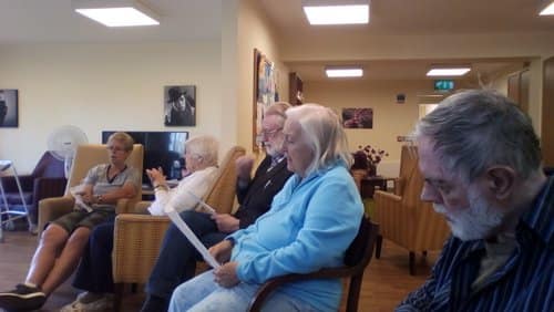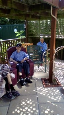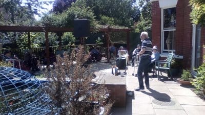 Our new terrace under the pergola is working well for residents, giving dappled shade on hot days. Like today, enjoying live music at the Lodge today: