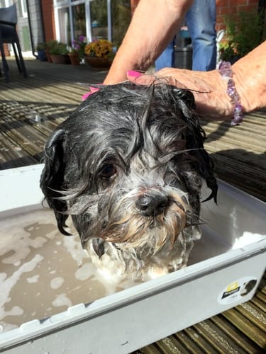 Dougal decided to explore underneath the garden shed, when we finally got him out he was in a very dirty state (mucky pup)
