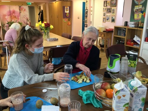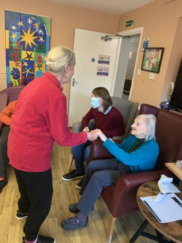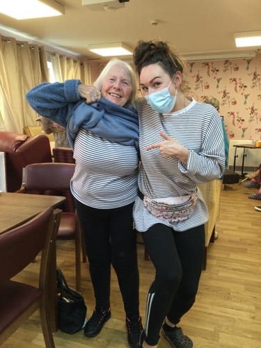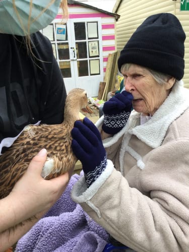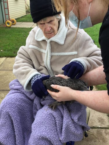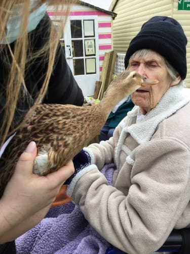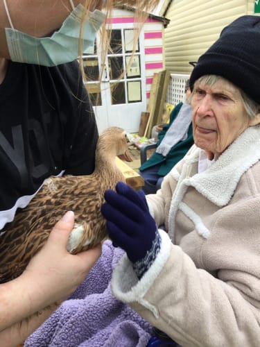Ash can be seen regularly bringing the ducks in for a cuddle. Chickens or guinea pigs too…. On Friday some of us braved the fresh air and came out to see our animals.